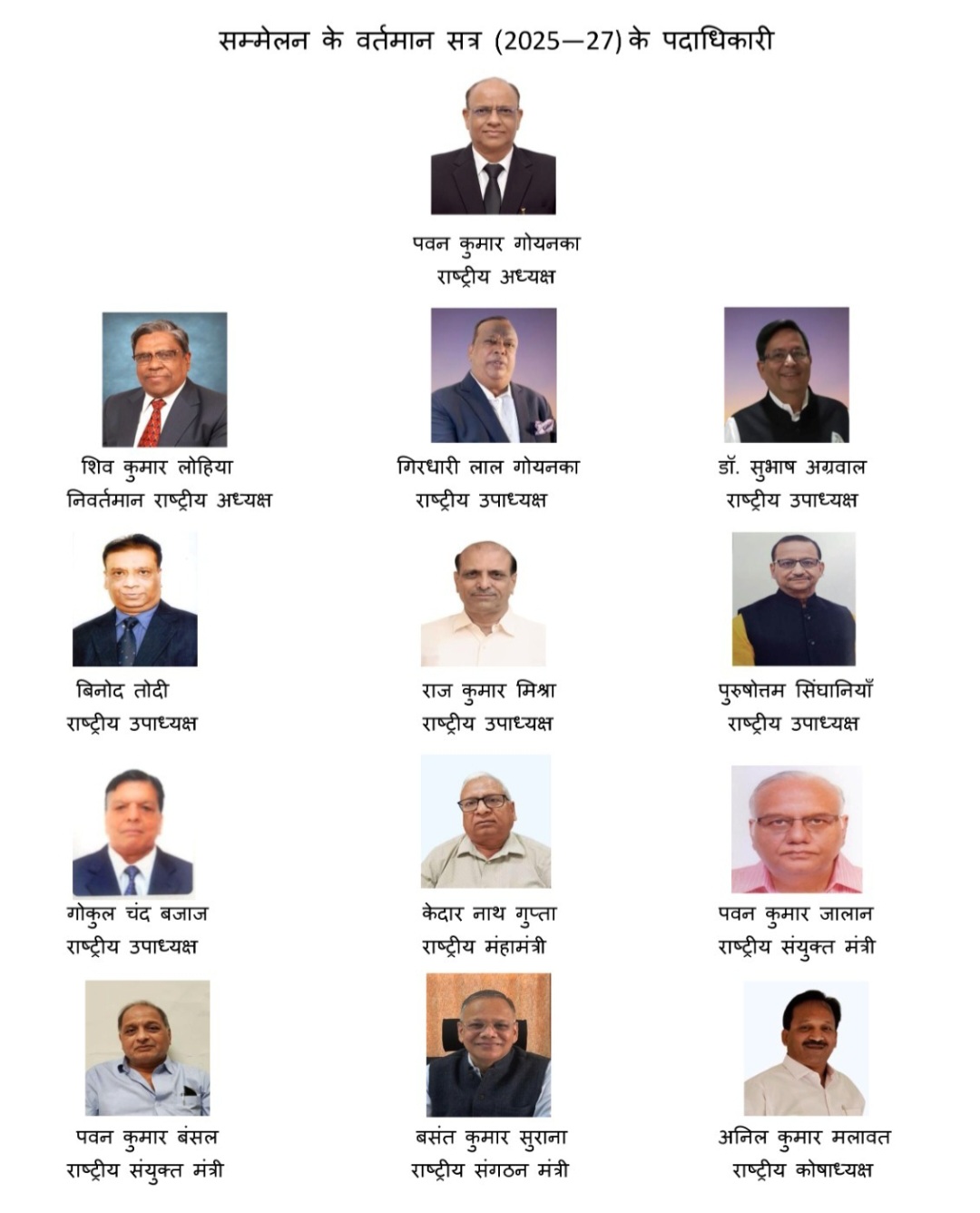तत्पश्चात 25 सितंबर को अन्य राष्ट्रीय पदाधिकारियों की औपचारिक घोषणा की गई। श्री गोयनका ने राष्ट्रीय उपाध्यक्ष पद पर कोलकाता से सम्मेलन के विशिष्ट संरक्षक सदस्य गिरधारी लाल गोयनका, कर्नाटक के संस्थापक अध्यक्ष डॉ. सुभाष अग्रवाल, बिहार के पूर्व प्रादेशिक अध्यक्ष बिनोद तोदी, दिल्ली के पूर्व प्रादेशिक अध्यक्ष राज कुमार मिश्रा, छत्तीसगढ़ के पूर्व प्रादेशिक अध्यक्ष पुरुषोत्तम सिंघानिया तथा गुजरात के निवर्तमान प्रादेशिक अध्यक्ष गोकुल चंद बजाज को मनोनीत किया।