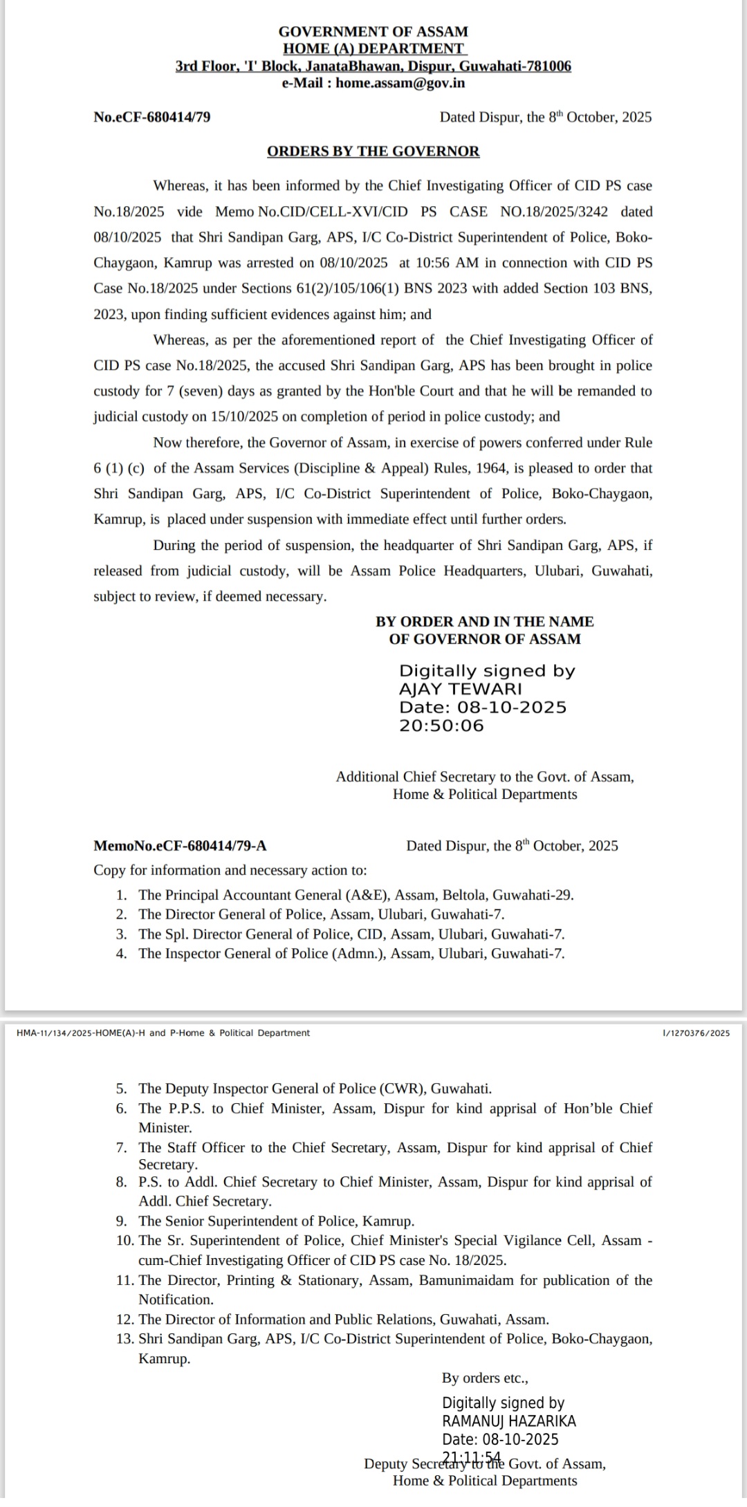 राज्यपाल ने उक्त तथ्यों को ध्यान में रखते हुए और असम सेवाएं (अनुशासन एवं अपील) नियम, 1964 के नियम 6(1)(c) के तहत प्रदत्त शक्तियों का प्रयोग करते हुए संदीपन गर्ग को तत्काल प्रभाव से निलंबित करने का आदेश दिया है। आदेश में कहा गया है कि निलंबन की अवधि के दौरान यदि श्री गर्ग न्यायिक हिरासत से रिहा होते हैं, तो उनका मुख्यालय असम पुलिस मुख्यालय, उलूबाड़ी, गुवाहाटी रहेगा। आवश्यकता पड़ने पर मुख्यालय स्थान की समीक्षा भी की जा सकती है।
