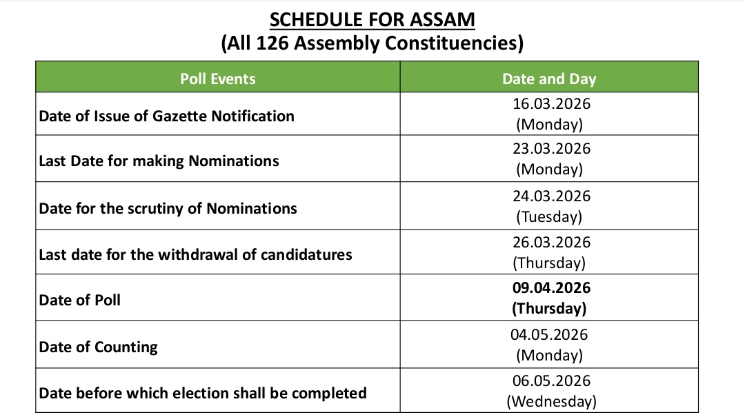 घोषित कार्यक्रम के अनुसार असम, केरल और पुडुचेरी में 9 अप्रैल को मतदान कराया जाएगा, जबकि तमिलनाडु में 23 अप्रैल को मतदान होगा।