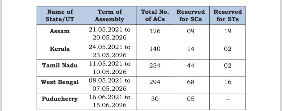 इलेक्शन कमीशन ऑफ़ इंडिया(ईसीआई) ने पांच राज्यों और एक केंद्र शासित प्रदेश में होने वाले आगामी विधानसभा चुनावों की तारीखों की घोषणा कर दी है। जिन राज्यों और केंद्र शासित प्रदेशों में चुनाव होने हैं उनमें असम,तमिलनाडु, वेस्ट बंगाल,केरेला और केंद्र शासित प्रदेश पुडुचेरी शामिल हैं।