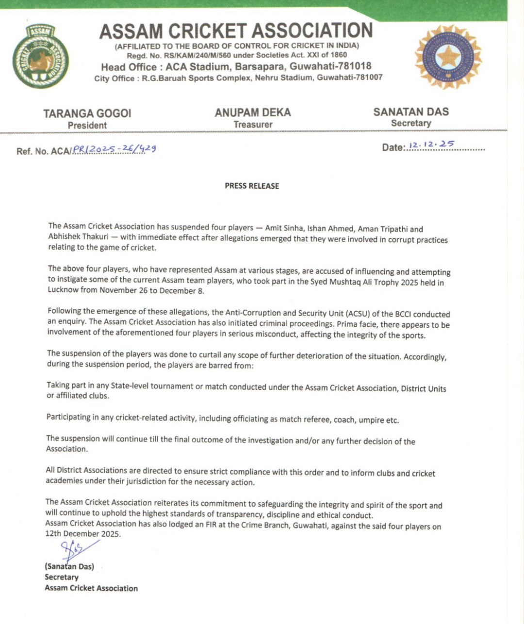 असम क्रिकेट को उस समय गहरा झटका लगा जब असम क्रिकेट संघ (एसीए) ने भ्रष्ट आचरण के गंभीर आरोपों में चार खिलाड़ियोंअमित सिन्हा, ईशान अहमद, अमन त्रिपाठी और अभिषेक ठाकुरी को तत्काल प्रभाव से निलंबित कर दिया। ये सभी खिलाड़ी विभिन्न स्तरों पर असम का प्रतिनिधित्व कर चुके हैं।