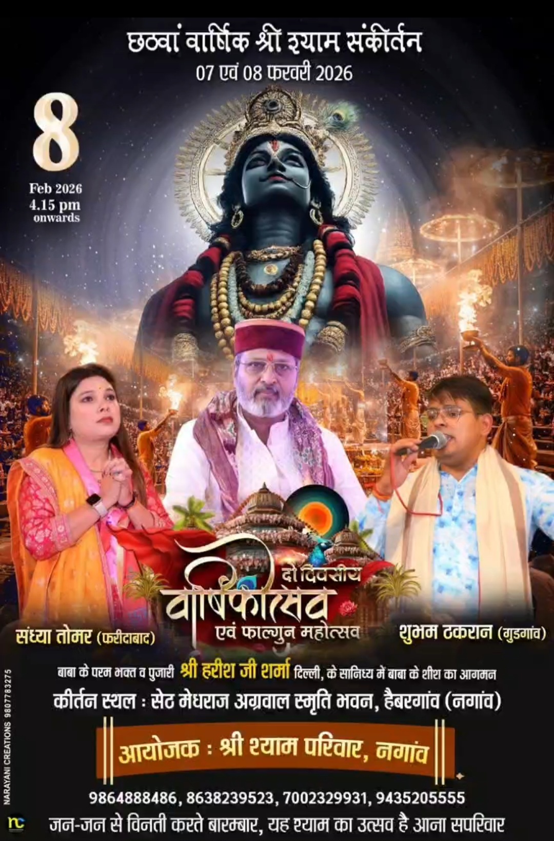 नगांव में छठवां वार्षिक श्री श्याम संकीर्तन एवं फाल्गुन महोत्सव 7-8 फरवरी को, देश के ख्यातिलब्ध भजन गायक करेंगे हाजरी
