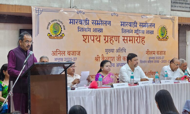 राजस्थान विश्राम भवन, शिलांग में मारवाड़ी सम्मेलन शिलांग शाखा एवं महिला शाखा का शपथ ग्रहण समारोह उत्साहपूर्वक और गरिमामय वातावरण में संपन्न हुआ। समारोह की अध्यक्षता प्रांतीय उपाध्यक्ष विनोद कुमार लोहिया ने की, जबकि प्रांतीय अध्यक्ष कैलाश काबरा मुख्य अतिथि के रूप में उपस्थित रहे।