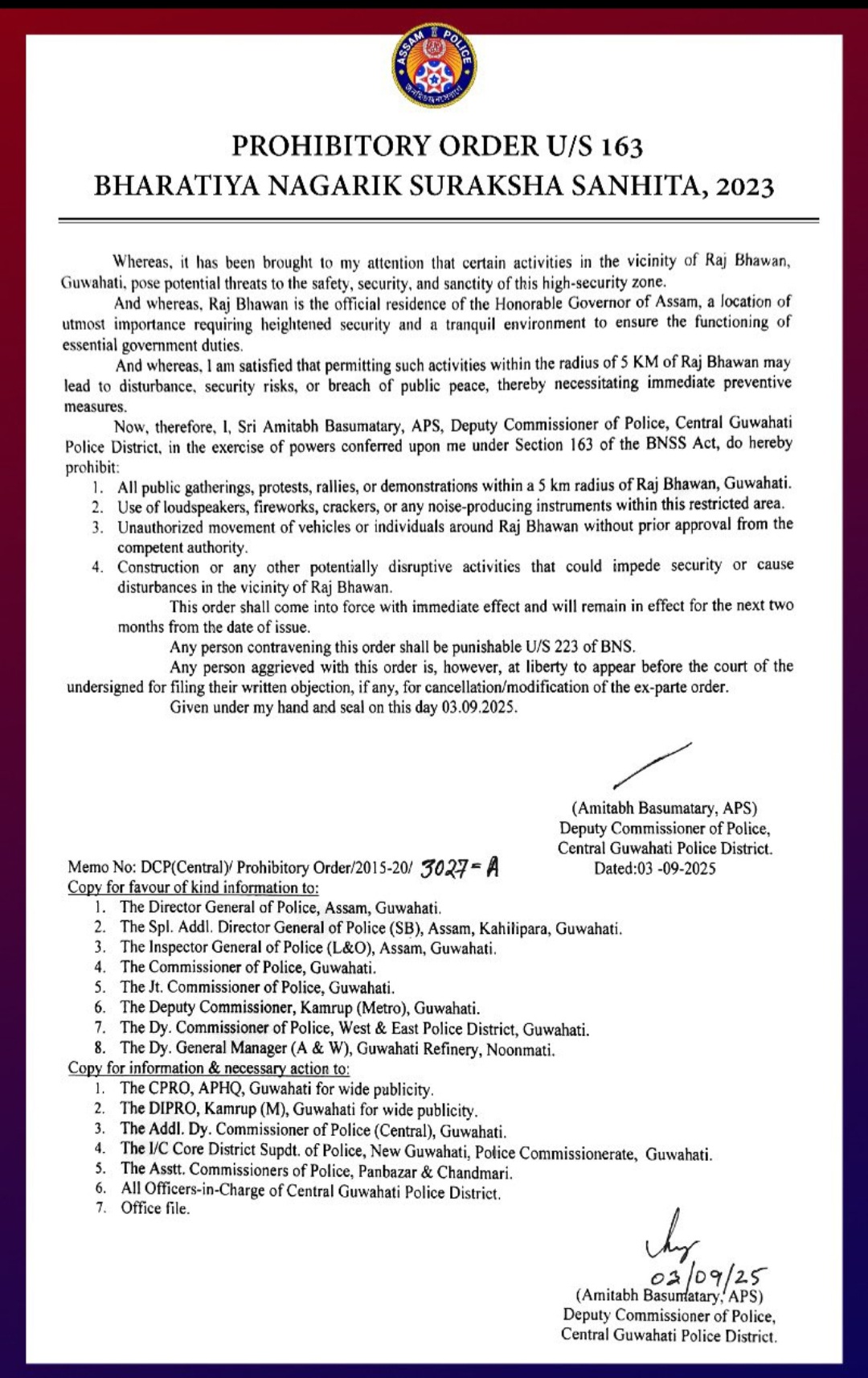 राज्यपाल आवास राजभवन के आसपास सुरक्षा एवं शांति व्यवस्था बनाए रखने के लिए पुलिस प्रशासन ने कड़े कदम उठाए हैं। केंद्रीय गुवाहाटी पुलिस जिला के उपायुक्त (डीसीपी) अमिताभ बसुमातरी ने भारतीय नागरिक सुरक्षा संहिता, 2023 की धारा 163 के तहत निषेधाज्ञा जारी कर दी है।