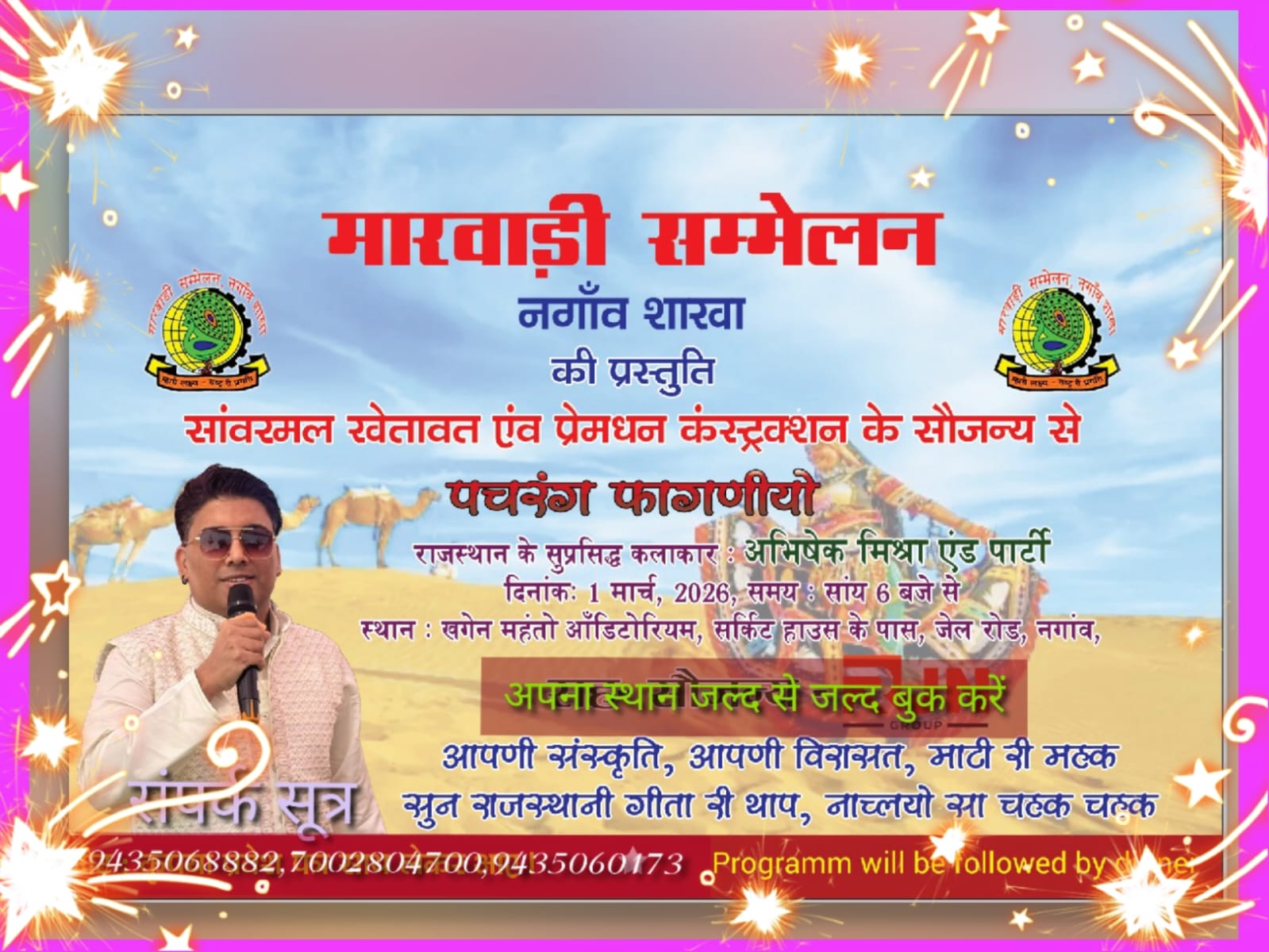 राजस्थान की लोकसंस्कृति की रंगत अब नगांव में भी नजर आएगी। होली के पावन अवसर पर मारवाड़ी सम्मेलन, नगांव शाखा की ओर से 1 मार्च (रविवार) को भव्य सांस्कृतिक कार्यक्रम “पचरंग फागणीयो” का आयोजन किया जा रहा है। यह कार्यक्रम सर्किट हाउस के पास स्थित खगेन महंत ऑडिटोरियम, जेल रोड में आयोजित होगा।